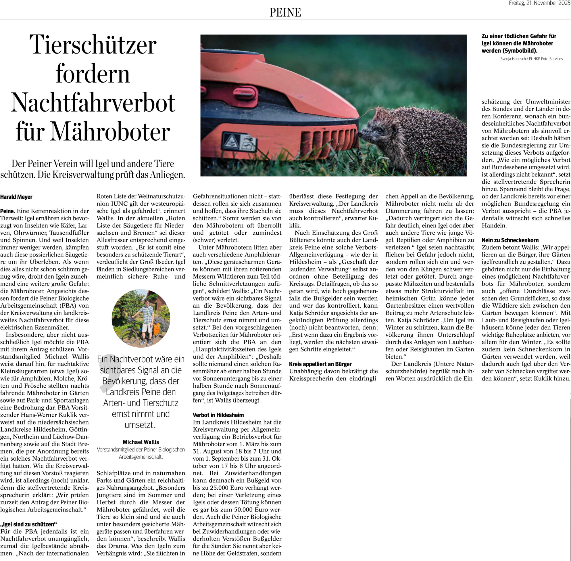PBA fordert Nachtfahrverbot von Mährobotern: Pressebericht der Peiner Nachrichten vom 21.11.2025