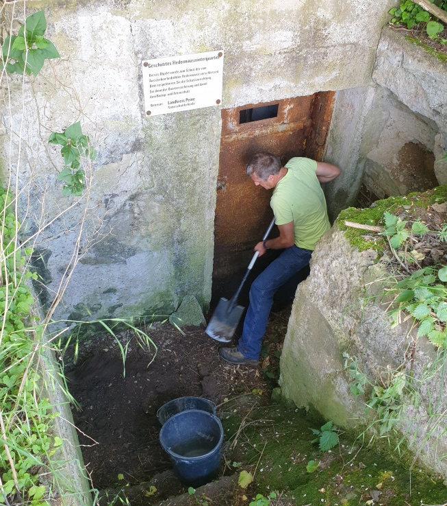Die Tür konnte endlich im August 2021 geöffnet werden. Bei der anschließenden Untersuchung des Bunkers fanden wir eine hohe Anzahl von aufgestellten Schlafsteinen, deren Ritze und Löcher im Winter als Schlafstellen dienen könnten.