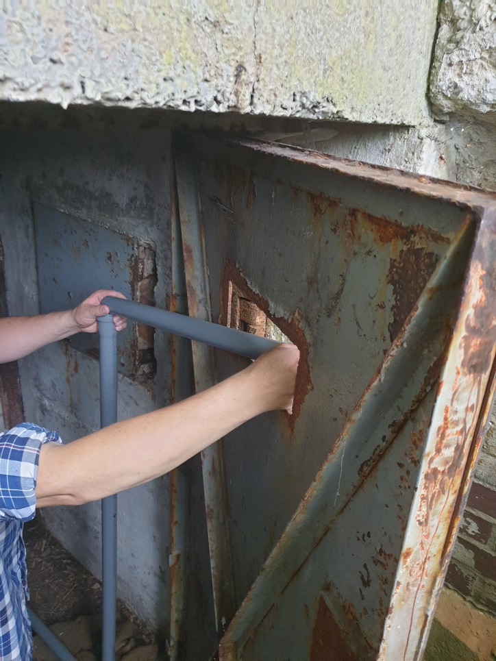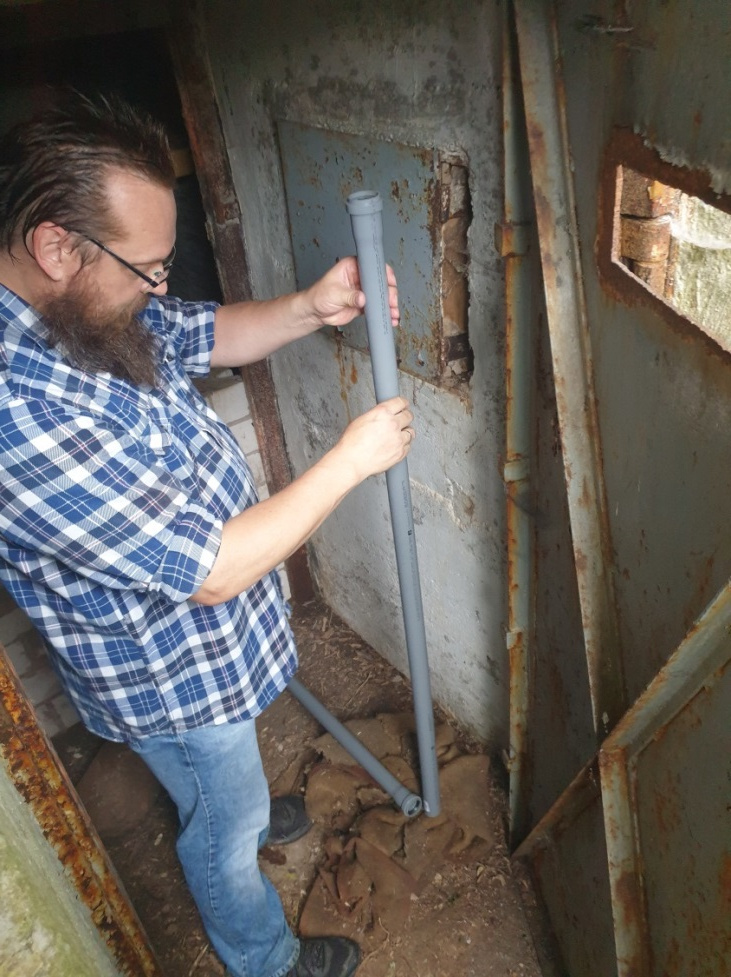Hiernach waren weitere Einsätze während des Sommers notwendig, um die eiserne Eingangstür öffnen zu können, die über viele Jahre in dem eisernen Türrahmen eingerostet war. Wiederholte Hammerschläge und der Einsatz rostlösender Sprays über mehrere Tage waren dafür notwendig! Dann musste noch die über viele Jahre angesammelte teilweise knietiefe Erdschicht vor der Tür entfernt werden.